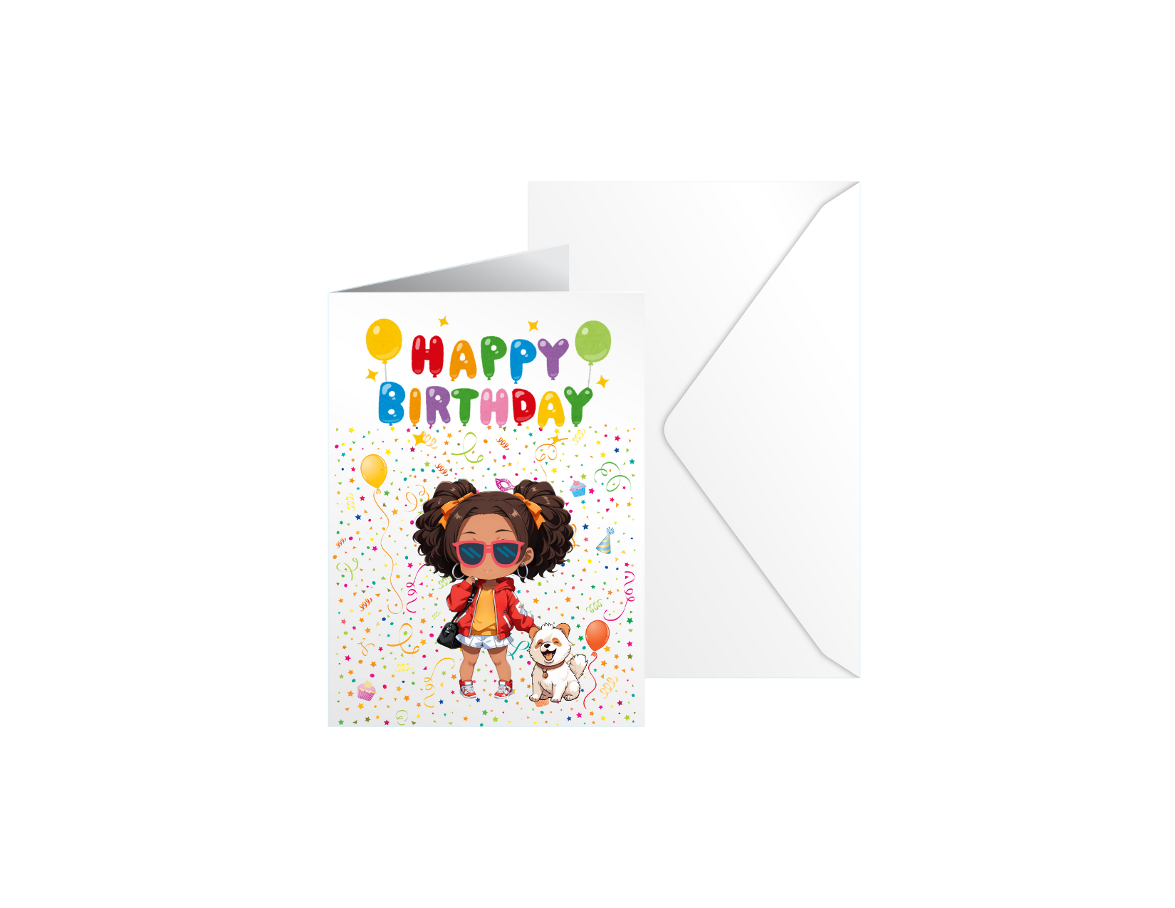 Celebrate any little girl's birthday with our adorable birthday card. Featuring a smiling girl wearing sunglasses and surrounded by colorful balloons and confetti, this card is sure to bring joy and excitement to the special occasion. Perfect for any girly celebration, this card is a must-have for any birthday girl!