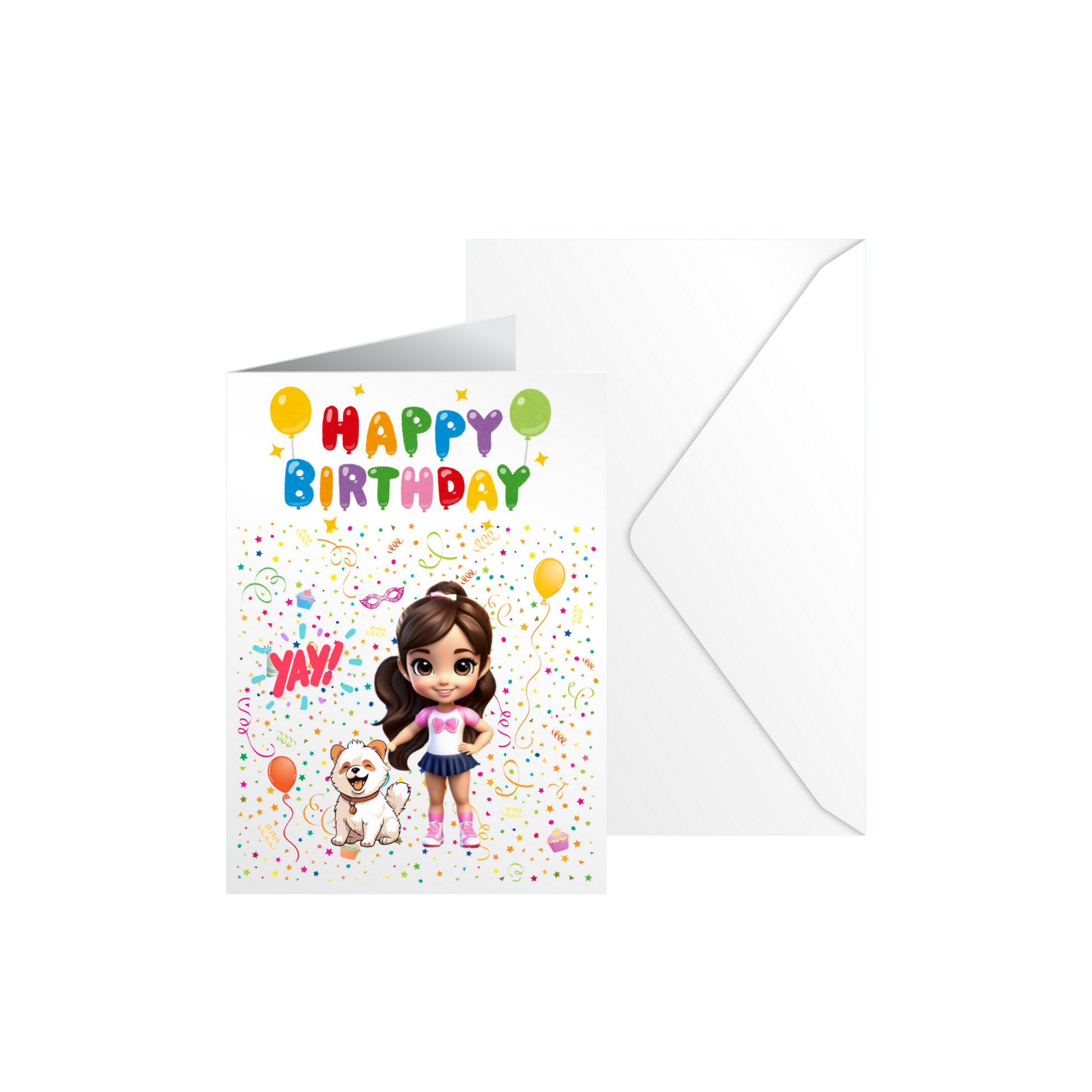 Happy Birthday Card features a charming illustration of a little girl and a dog surrounded by colorful confetti and balloons, creating a festive atmosphere. Send your warm wishes with this high-quality birthday card, perfect for any age and gender.