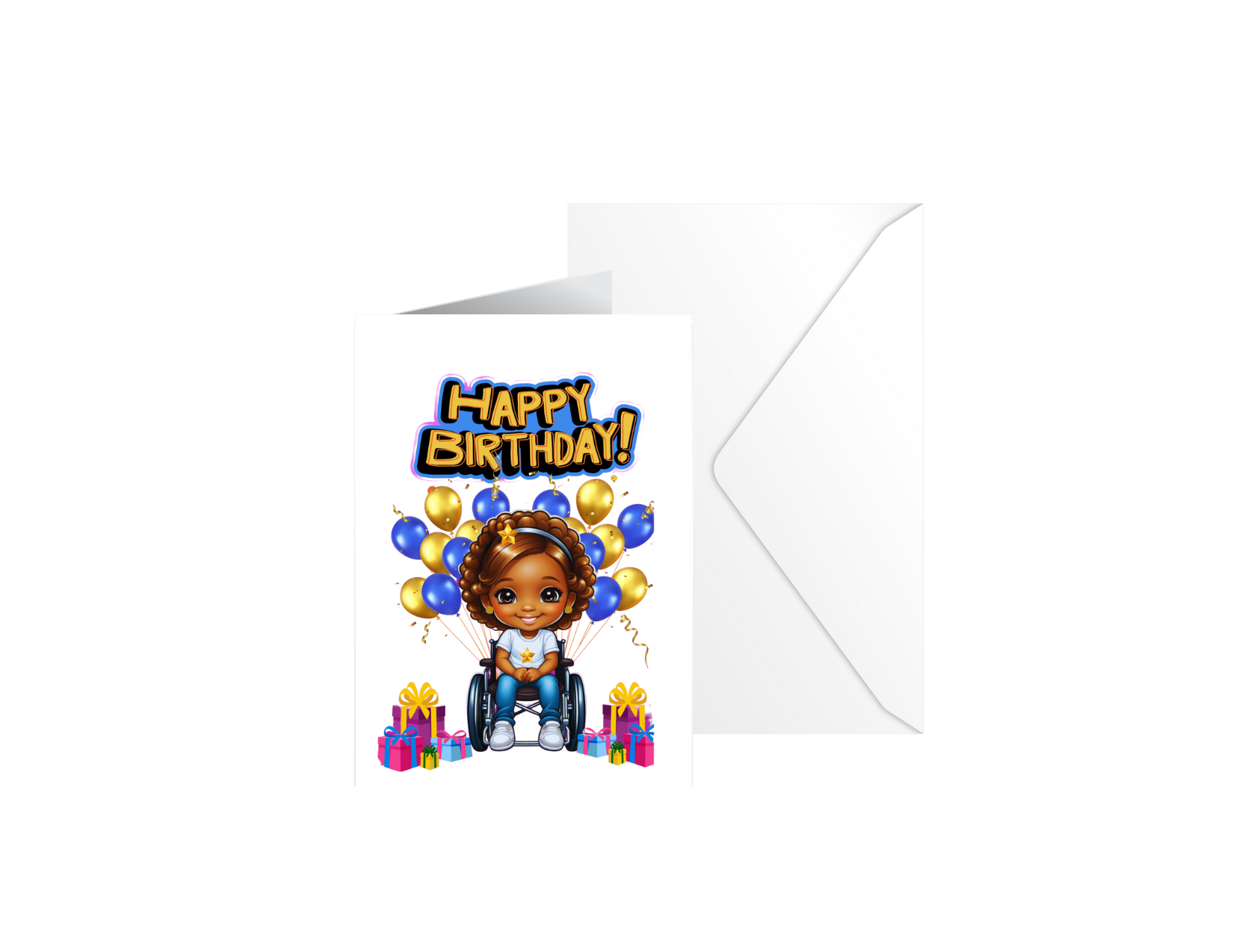 Celebrate with inclusivity and joy by sending this Happy Birthday card featuring a girl in a wheelchair with presents and balloons! Share the happiness with a personal touch.